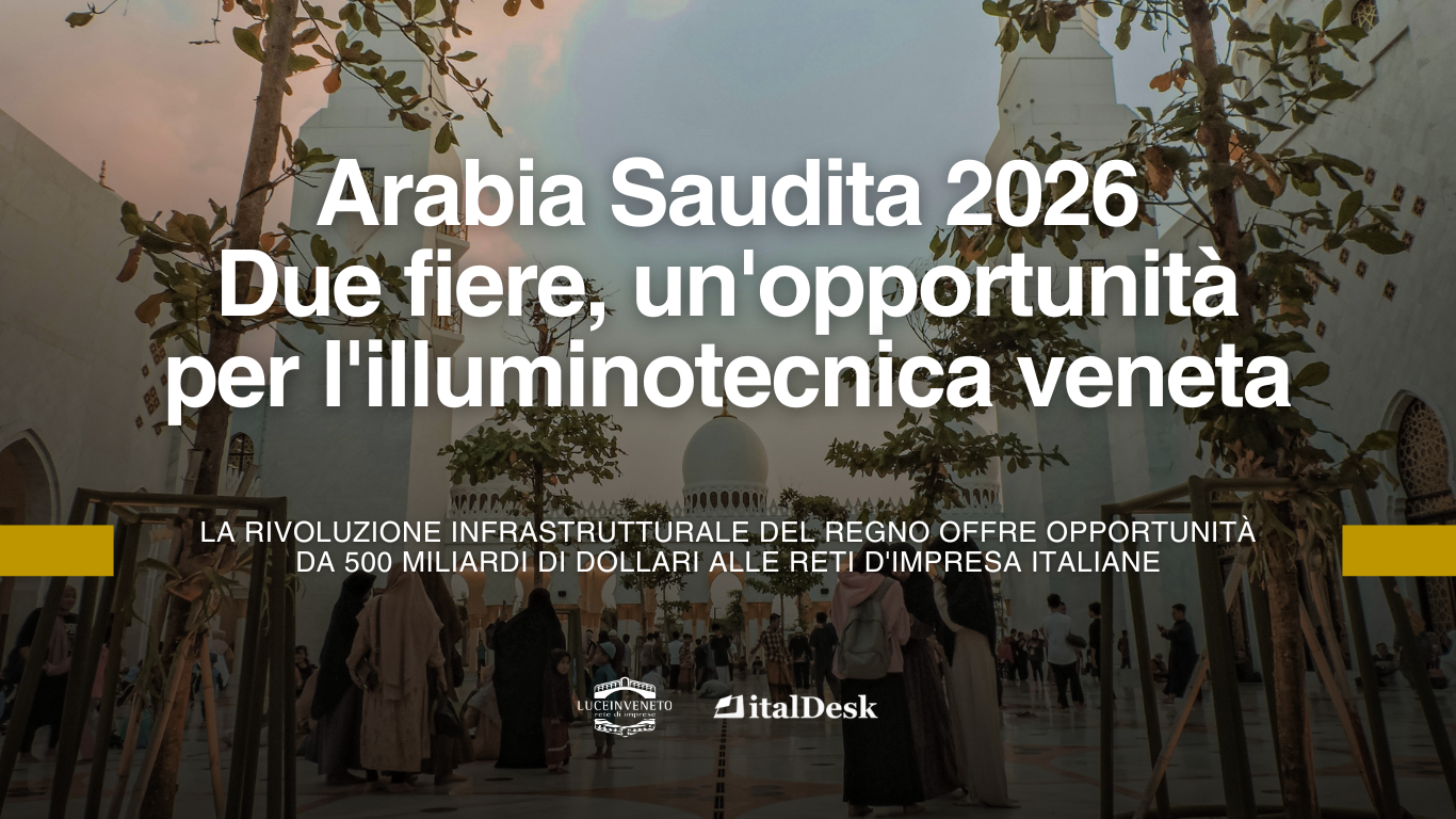 Il 2026 si preannuncia come l’anno di svolta per l’illuminotecnica veneta in Arabia Saudita. Due eventi di portata internazionale – Downtown Design Riyadh e Interiors & Furniture Show Jeddah – offriranno alle aziende della Rete di Imprese Luce in Veneto l’opportunità di posizionarsi sui segmenti più dinamici del mercato saudita: il luxury design e l’hospitality contract. Per massimizzare questa opportunità, Italdesk ha strutturato un pacchetto di servizi esclusivo riservato alle prime cinque aziende associate che manifesteranno interesse.