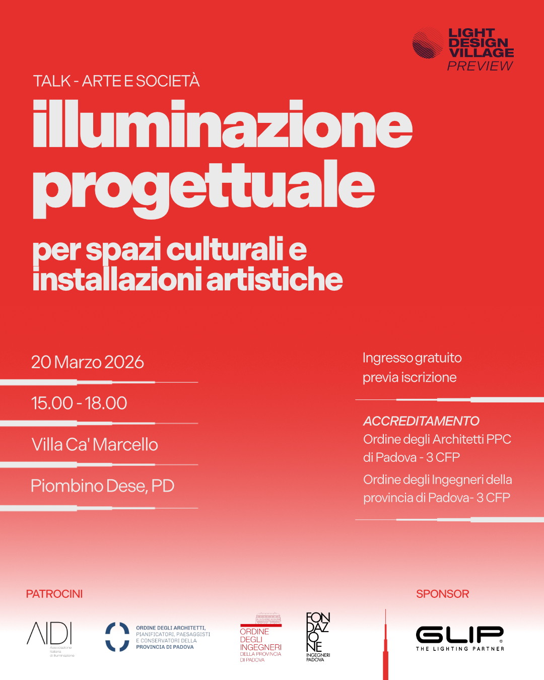 Villa Ca Marcello Via dei Marcello n°13/11, Levada di Piombino Dese (PD)Illuminazione progettuale per spazi culturali e installazioni artistiche Light Design Village Preview  VENERDI 20 MARZO 2026 dalle 15:00 alle...