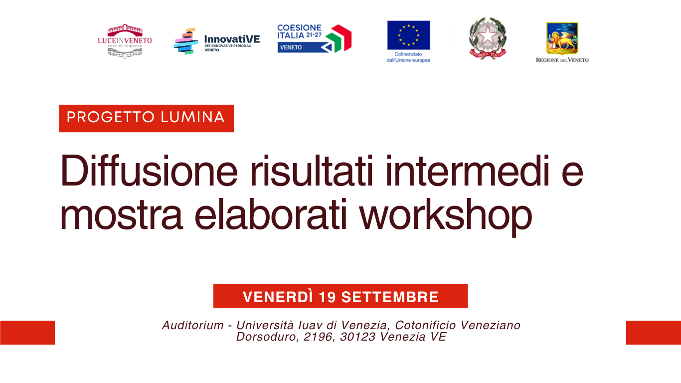 Venerdì 19 settembre 2025dalle 16:00 alle 18:30 presso l’Auditorium – Università Iuav di Venezia– Cotonificio Veneziano si terrà un evento pubblico finalizzato a presentare le attività di ricerca svolte nel primo anno di realizzazione del progetto denominato “LUMINA: Sviluppo e digitalizzazione di apparecchi di illuminazione innovativi e sostenibili” presentato dalla RIR Venetian Smart Lighting nell’ambito del PR Veneto FESR 2021-2027. Azione 1.1.1 sub A. DGR 729 del 26 giugno 2024.